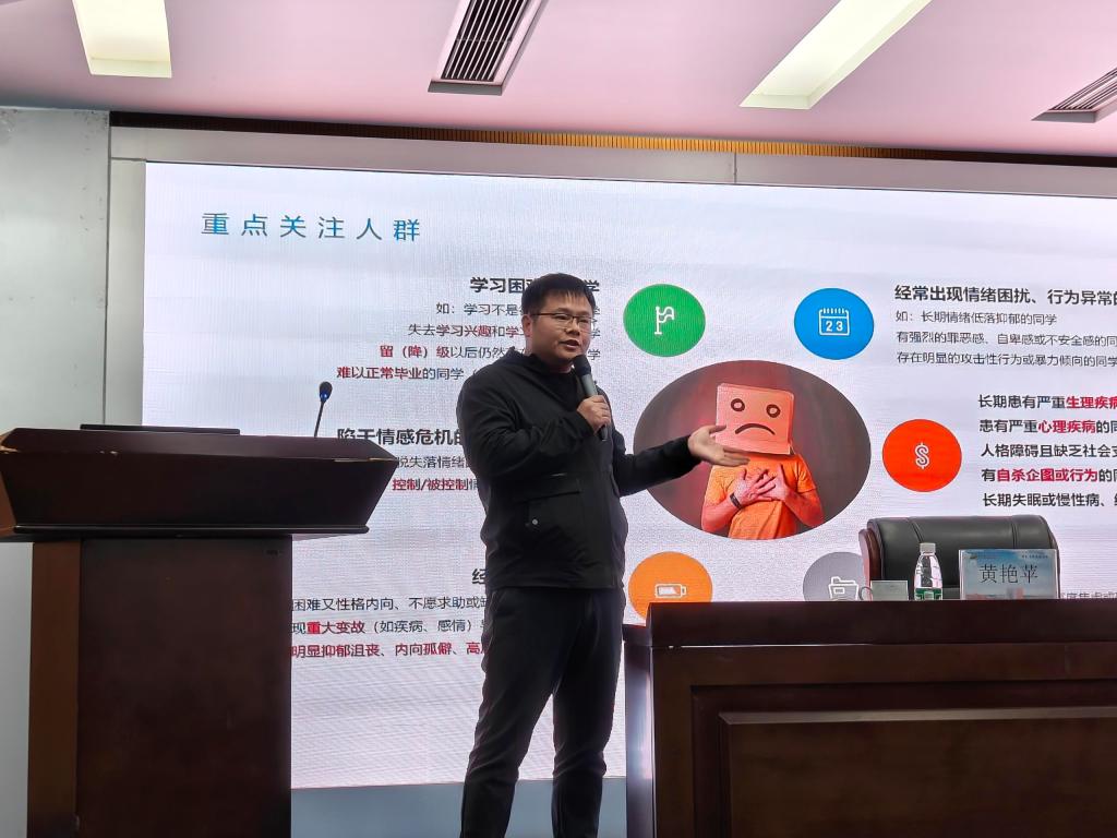 为进一步提高公司心理健康教育工作水平,完善“学校-学院-班级-宿舍”四级心理健康教育工作网络体系,充分发挥朋辈心理互助和桥梁纽带作用,提升宿舍心理联络员心理助人能力和责任意识,12月21日下午2点30分,太阳集团tyc4633邀请了广东工业大学心理健康教育中心黄艳苹副教授在图书馆报告厅展开了题为“心理联络员助人技能及危机识别”的精彩授课。太阳集团tyc4633全体辅导员和员工宿舍心理联络员参加了本次授课。